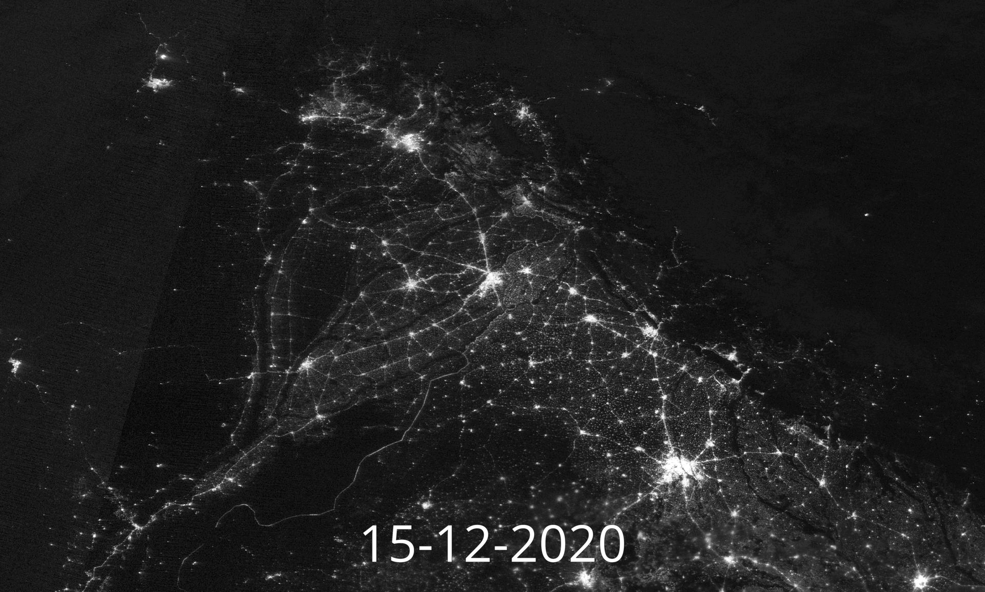 The two slides show the Northern India as captured by () at night. The comparison of two gives an idea of change in lighting over a 4 year period. The brightest cluster of lights is the capital New Delhi and surrounding cities.